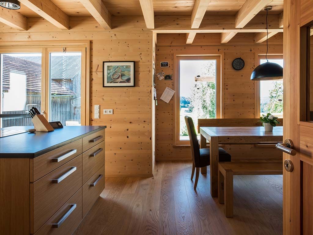- Sichtdachstuhl mit 40 mm Nut und Feder und 220 mm Holzfaserdämmplatten