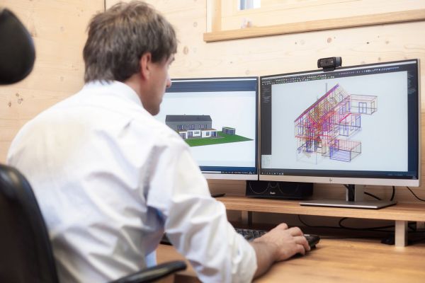 - Wir planen mithilfe der speziellen 3D CAD/CAM-Software die Wände bis zum Giebel mit Massivholz im Detail