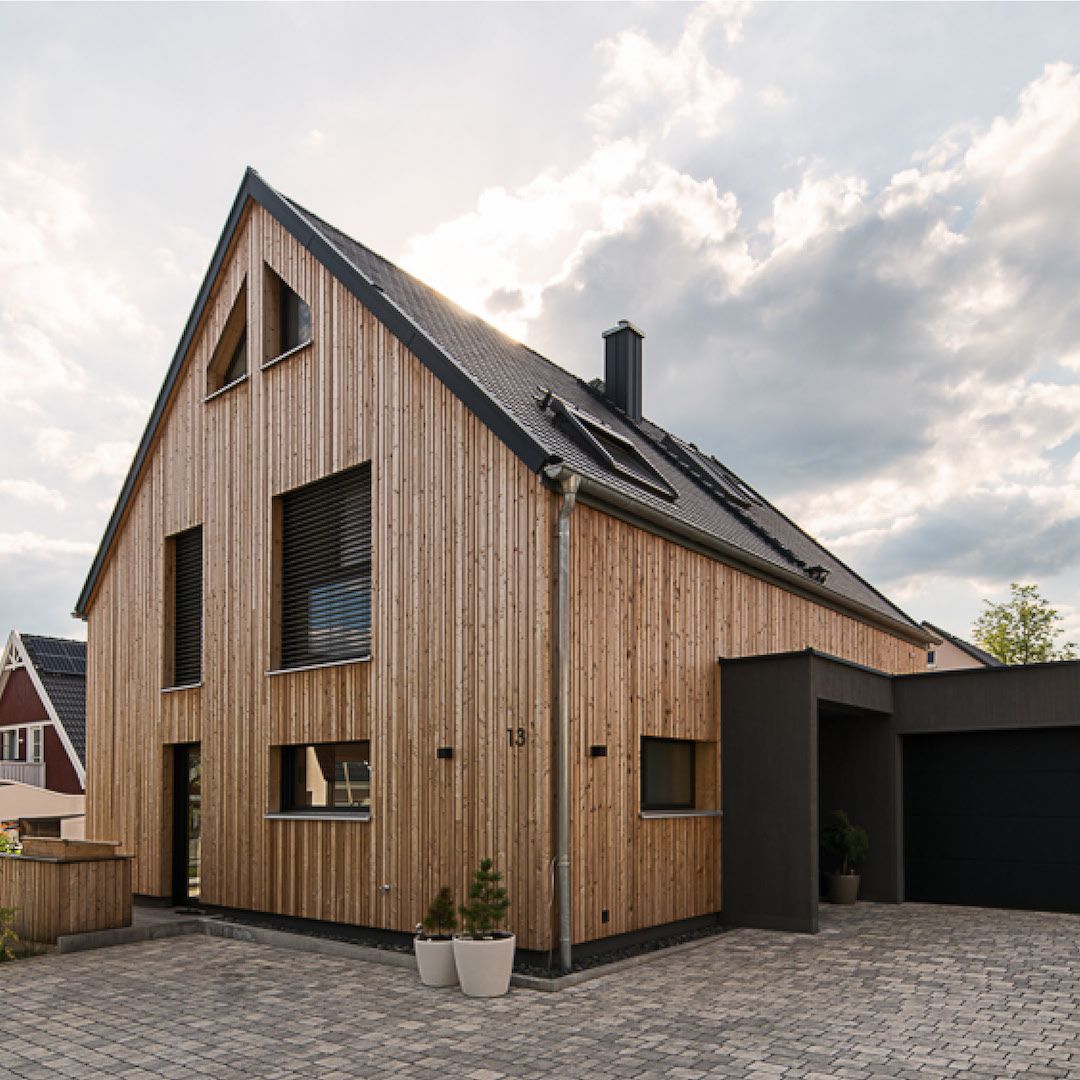 Auch in der Planung der Fassade zeigt sich ein weiterer Vorteil unserer Holzrahmenbauweise: Statische und energetische Aufgaben wie zum Beispiel Dämmung werden bereits von der Holzkonstruktion übernommen. An diese kann zusätzlich ein Trägersystem fixiert werden, um hinterlüftete Fassadenelemente vor der Außenwand zu montieren.